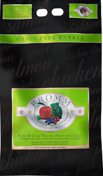Fromm Four-Star Surf & Turf Recipe is an exquisite, grain-free blend of salmon, chicken, and whitefish. This recipe is specially prepared to ensure consistency, quality, and superior taste in each and every bowl. Surf & Turf Recipe cat food provides complete and balanced nutrition for cats of all ages and can be alternated with other Fromm Four-Star recipes.