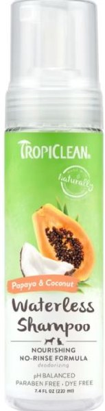TROPICLEAN WATERLESS PET SHAMPOO PAPAYA/COCONUT No rinse formula.